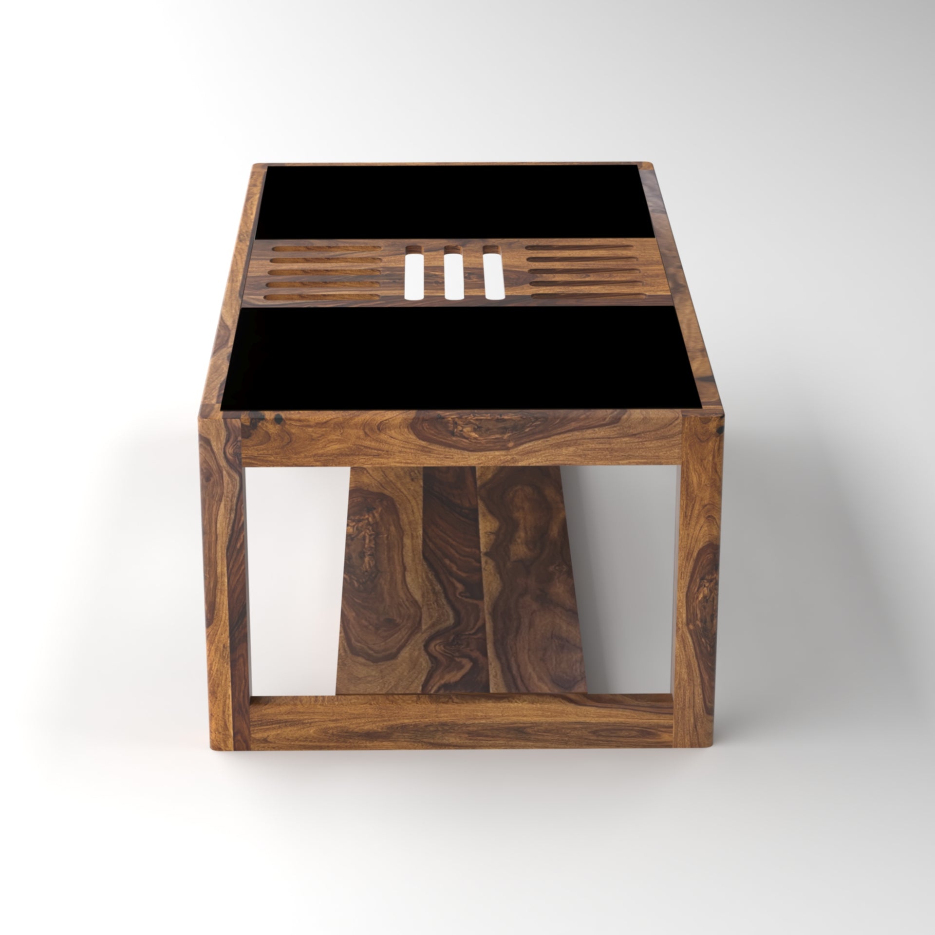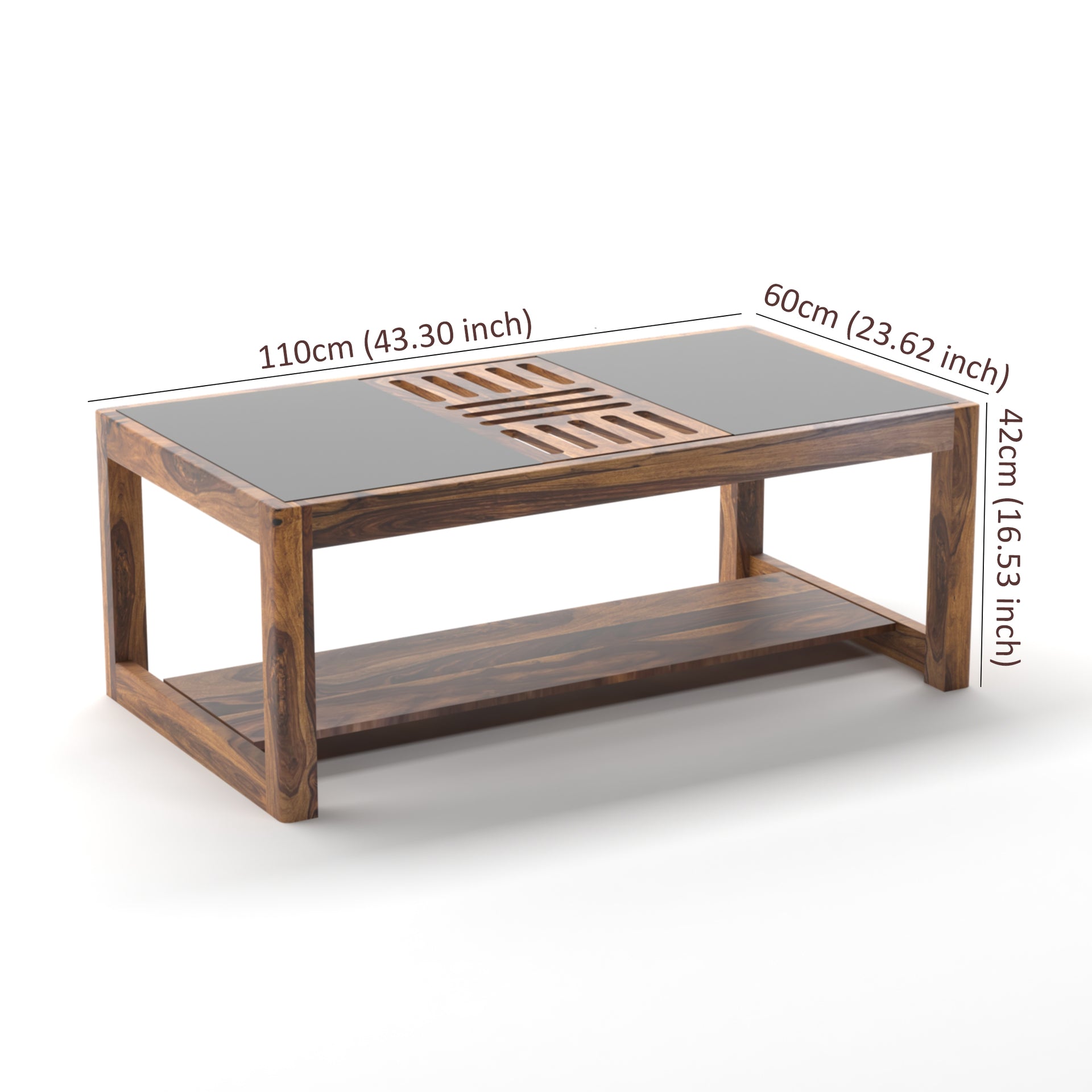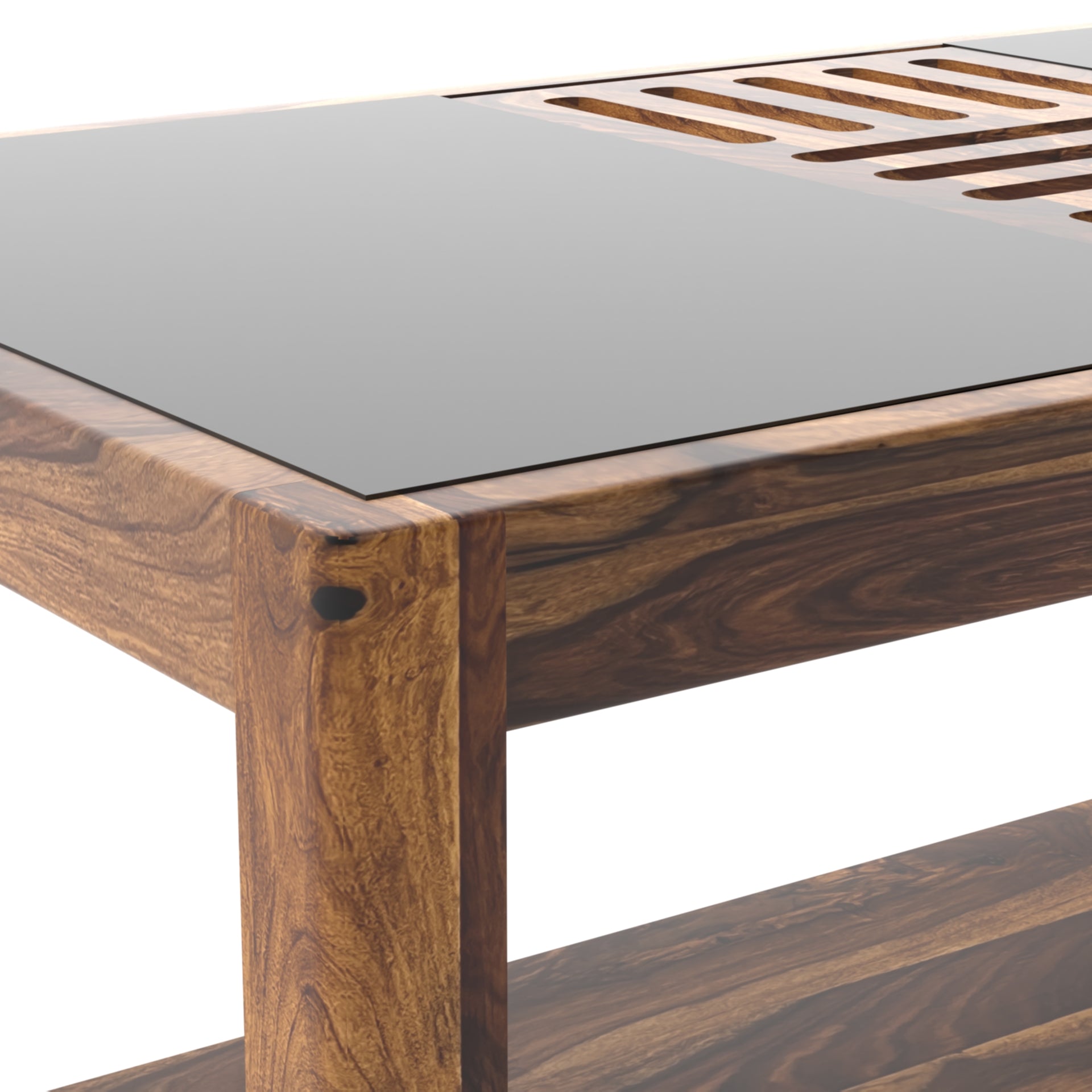 Toronto Sheesham Wood Rectangular Coffee Table can used in living-cubicle, lounge, waiting area, reception area and etc. The tabletop is created in a different way it has two 8mm tempered glass and 32cm wide plank in middle, which gives appealing look. Its rectangular table top is homespun, which provides a stable & secure surface on which you can place your drinks, vases, fruit bowls or etc. The spacious area underneath the tabletop can be used to keep newspaper, magazines, routine essentials things with ease. We used sheesham solid wood to craft this lovely table & also the wood was kiln dried before it is utilized.
