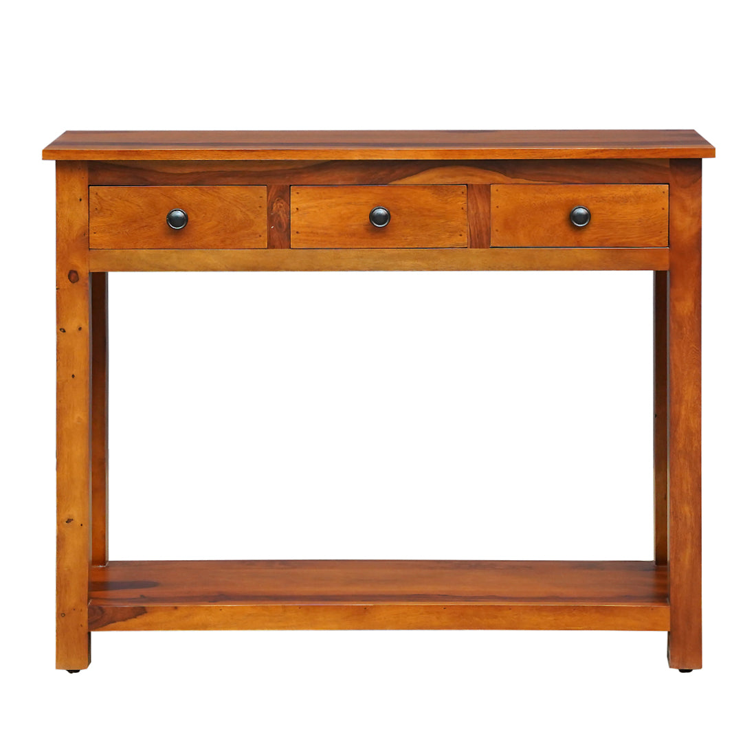 Lynton three drawers Console is designed for both home & office. It has great functionality with unpretentious-appealing looks. It is constructed from kiln dried sheesham solid wood to prevent joints splitting like problem and the wood is also chemically treated to prevent wood rotting like problem. If you are looking for a compact console then, this is perfect for you. It has ample open storage shelf and 3 drawers.
