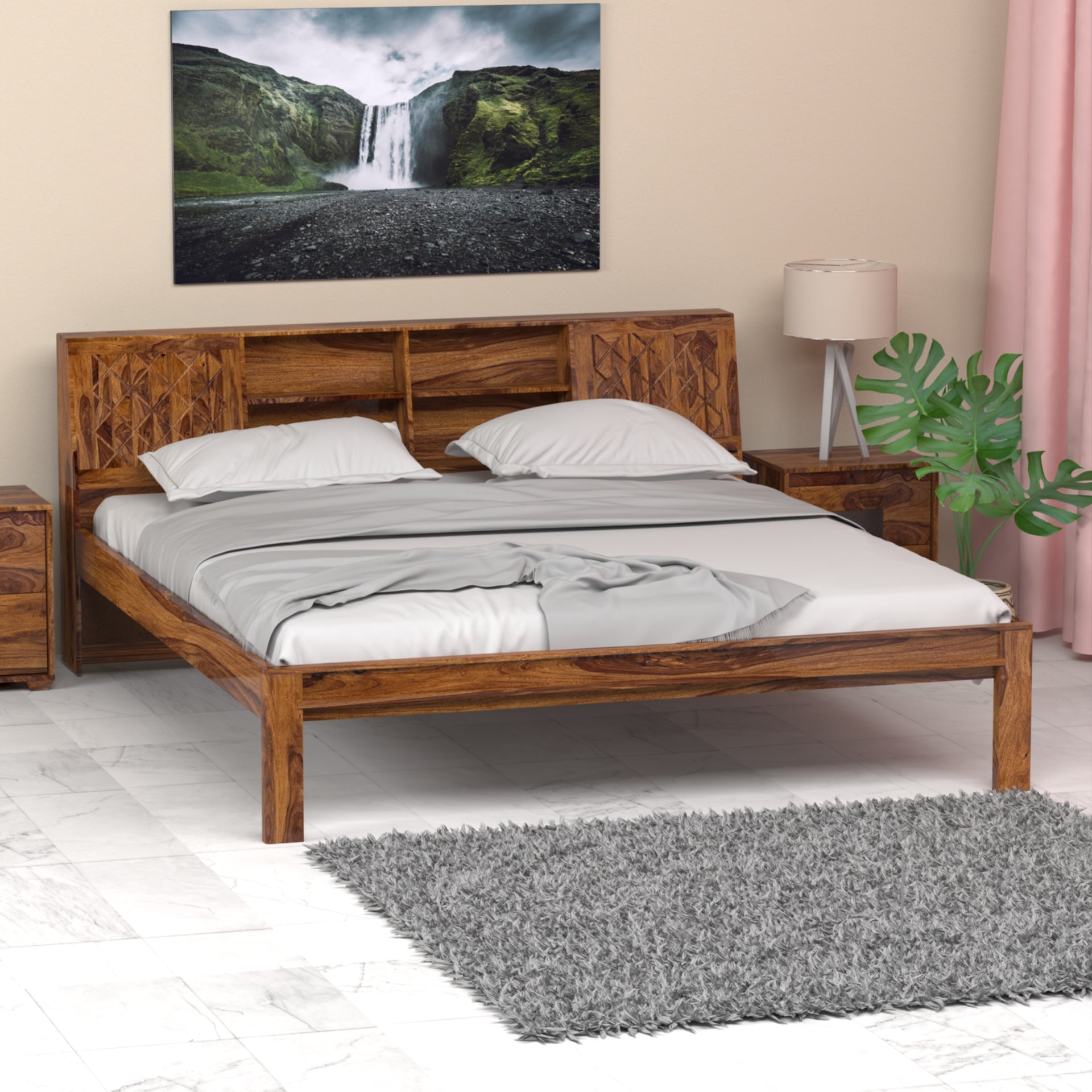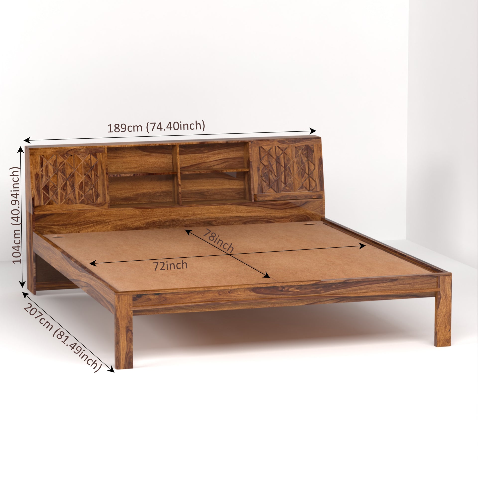Designed with your convenience in mind, the headboard features innovative sliding door storage, offering a discreet and practical solution for keeping essentials within reach. This king-size bed comfortably accommodates a 72x78 inch mattress, ensuring ample space for a restful night's sleep. Enjoy the perfect blend of style, strength, and user-friendly design with the Bergen Sheesham Wood King Size Bed – a true investment in your comfort and home.