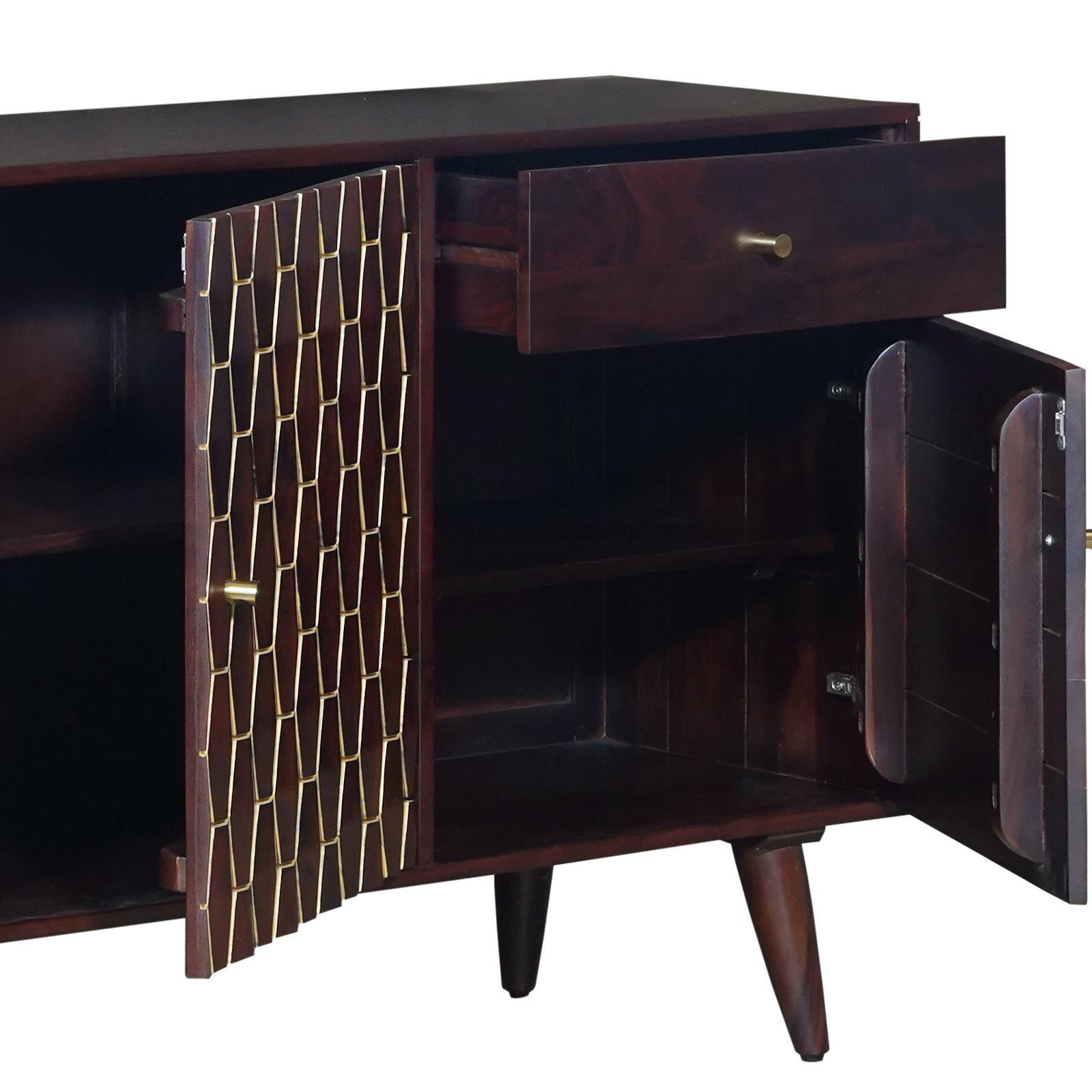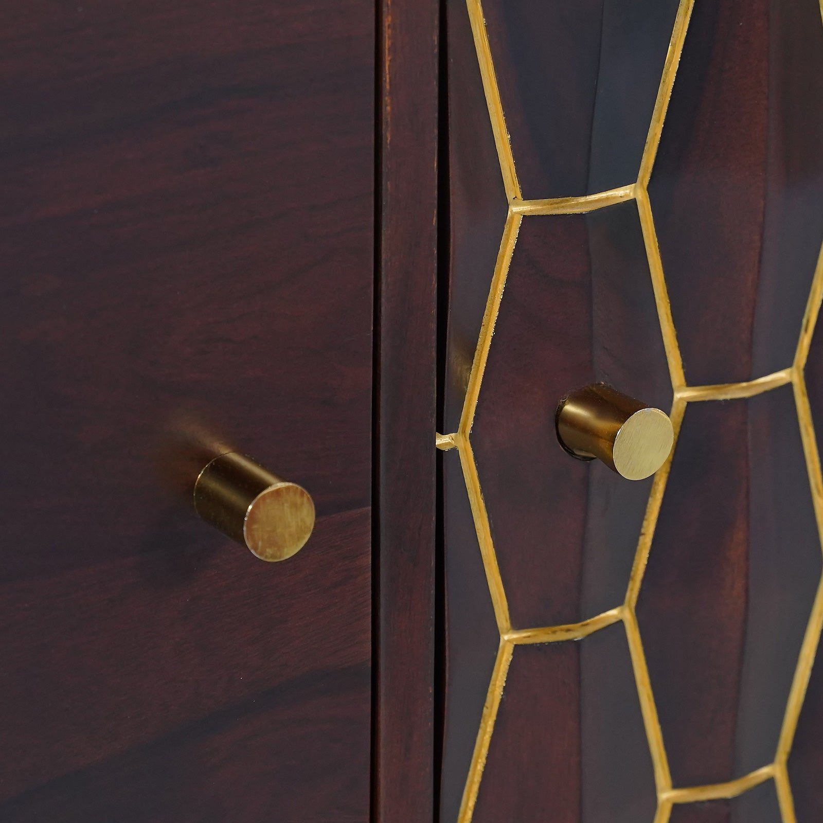 The defining feature of the Ruby Sideboard is its central cabinet door, which showcases an intricate, handcrafted wooden diamond cut pattern across its front. A striking golden finish is carefully applied within the grooves of this geometric design, instantly catching the eye and adding a luxurious, retro-chic flair to the entire piece. The design is complemented by sleek, fixed golden finish knobs on all doors and drawers, creating a cohesive and upscale look.