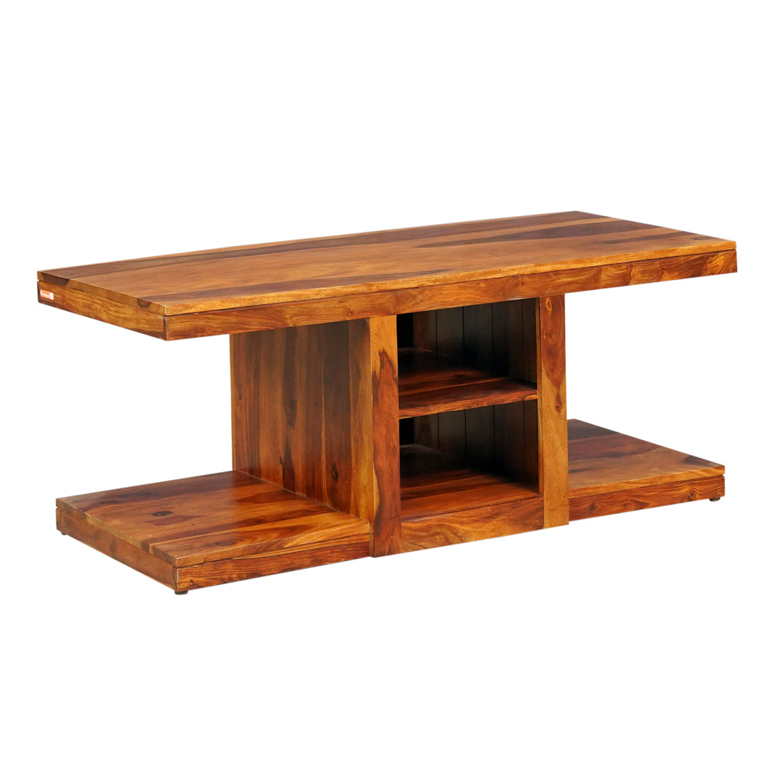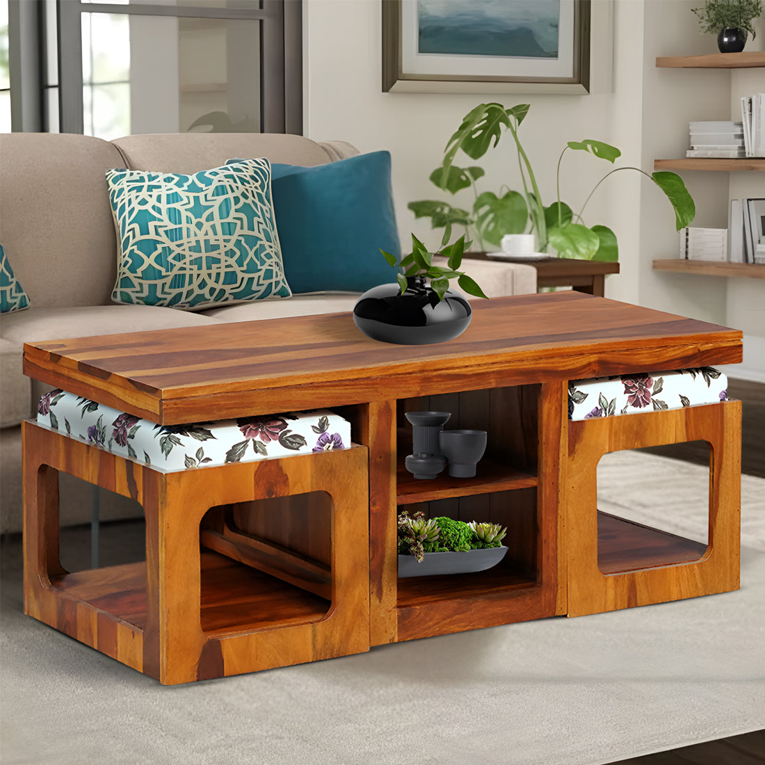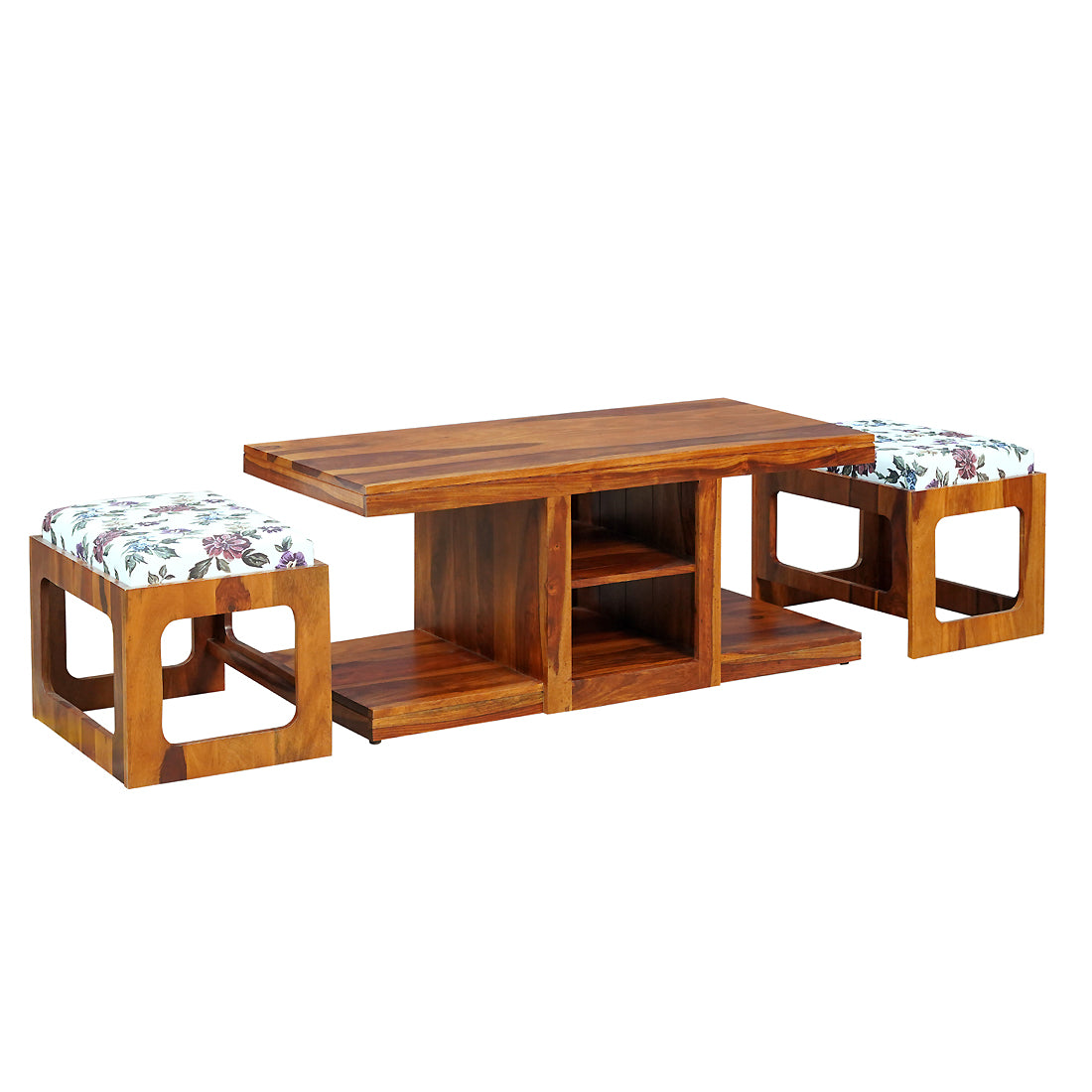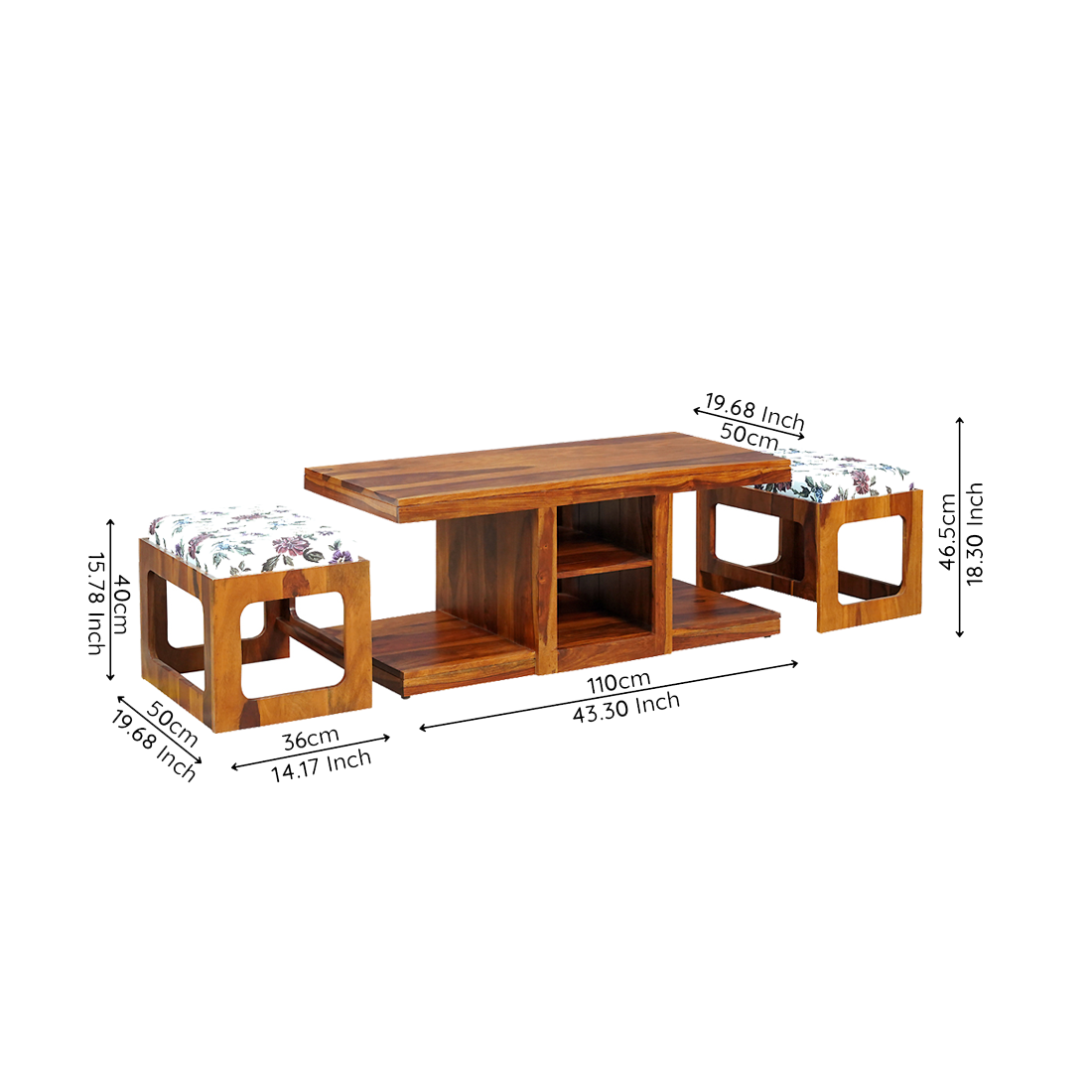 Halifax Sheesham Wood Coffee Table With 2 Stools is a quintessential table to save space. It can be used in lounge area or in living-cubicle. The seats are cozy & can be nested underneath of coffee table when not in use. Because of its spacious table top you can enjoy a delightful tea time with your family or entertain friends with refreshment at home with ease. It is crafted from solid sheesham wood & hence, it blessed with high quality, strength & durability. Sheesham wood is exceptionally more durable than most of other wood types. Last but not the least, the coffee table has two open niches in middle so, you can keep periodicals, newspaper and etc.