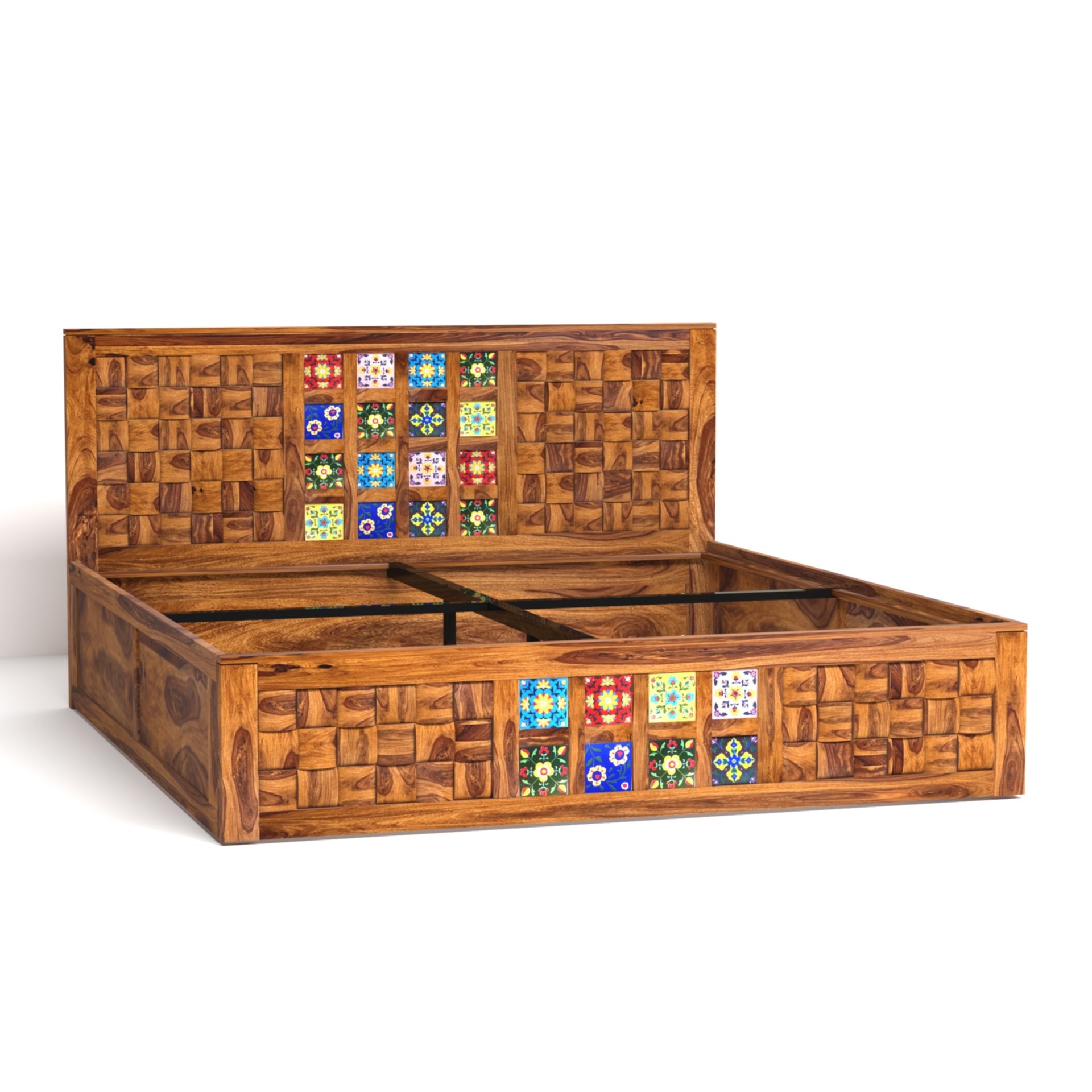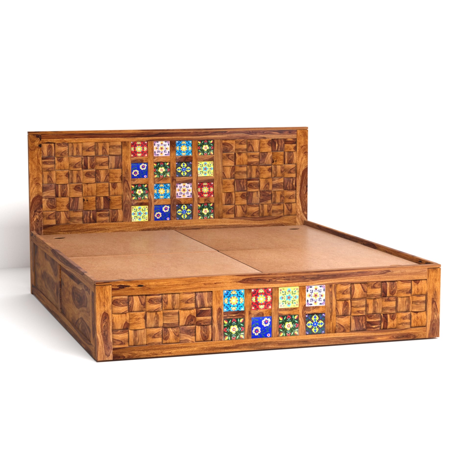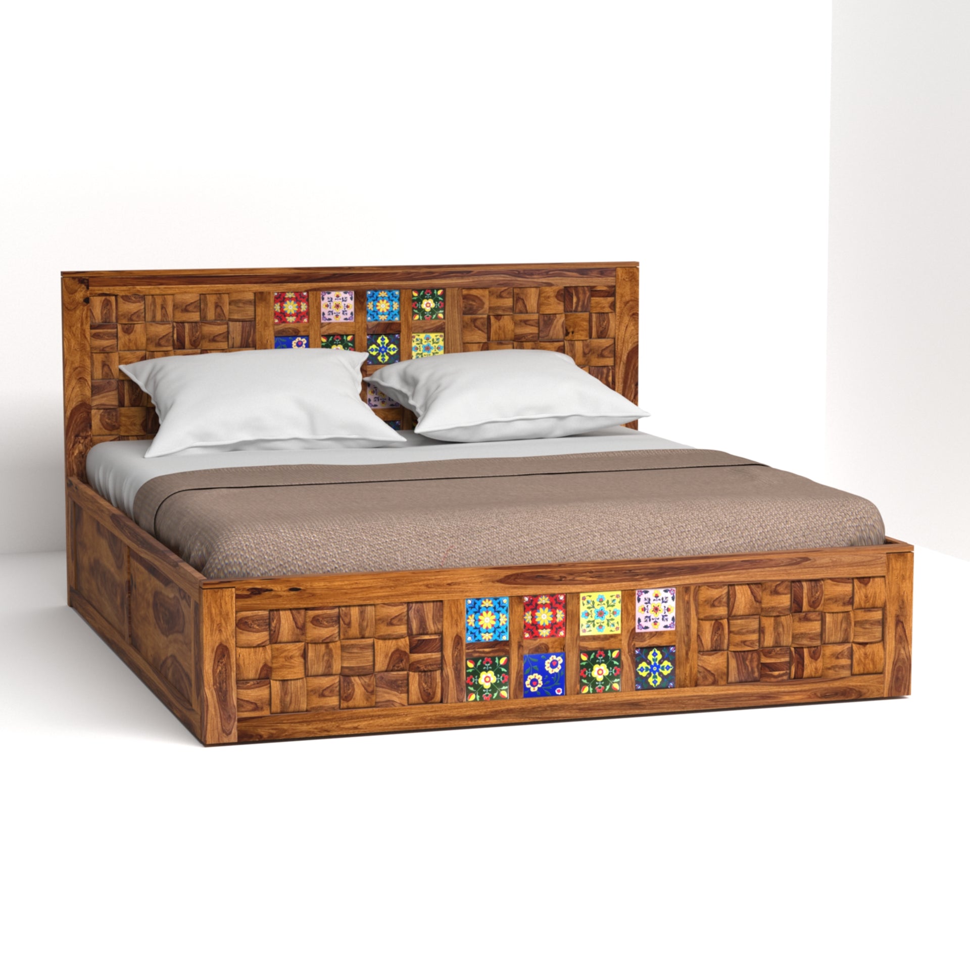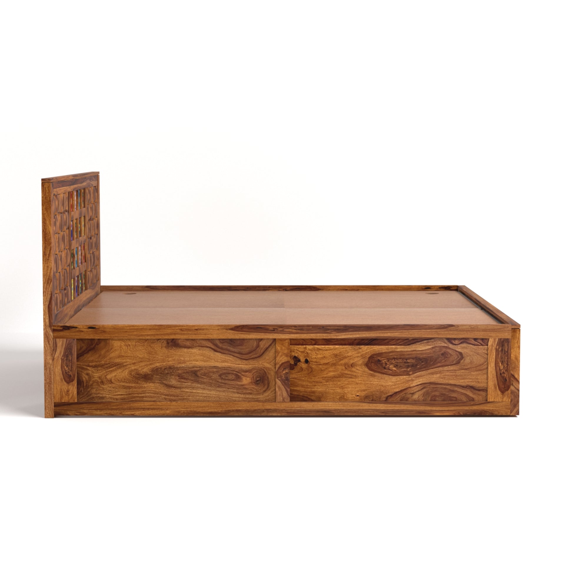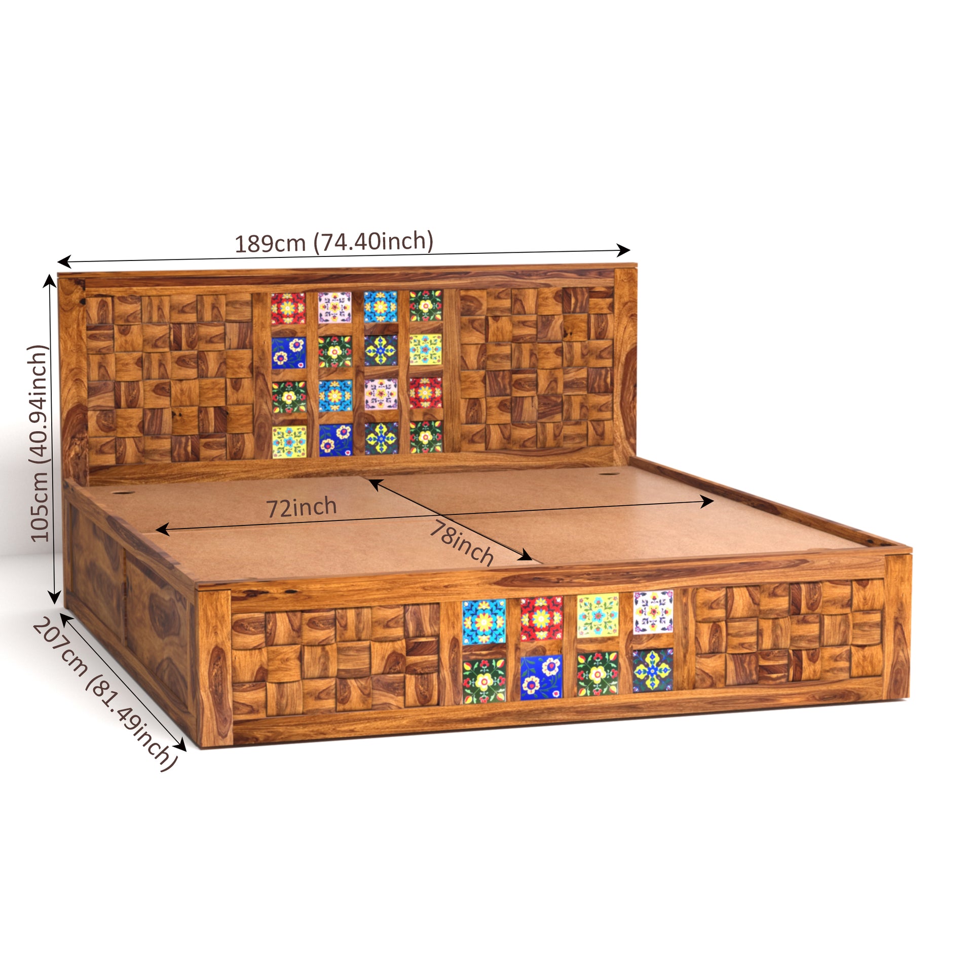 Maximize both style and functionality with the Amber Sheesham Wood King Size Bed with Box Storage. Crafted from kiln-dried and chemically treated solid sheesham wood, this bed guarantees exceptional durability and a timeless aesthetic. The stylish design seamlessly integrates into any bedroom, while the king-size dimensions, accommodating a 72x78 inch mattress, provide luxurious comfort. What sets this bed apart is its ample box storage, offering a convenient solution for keeping your bedroom organized and clutter-free. Easily store bedding, pillows, or other essentials within the spacious compartments beneath the mattress. Enjoy the perfect blend of beauty, strength, and practicality with the Amber Sheesham Wood King Size Bed with Box Storage.