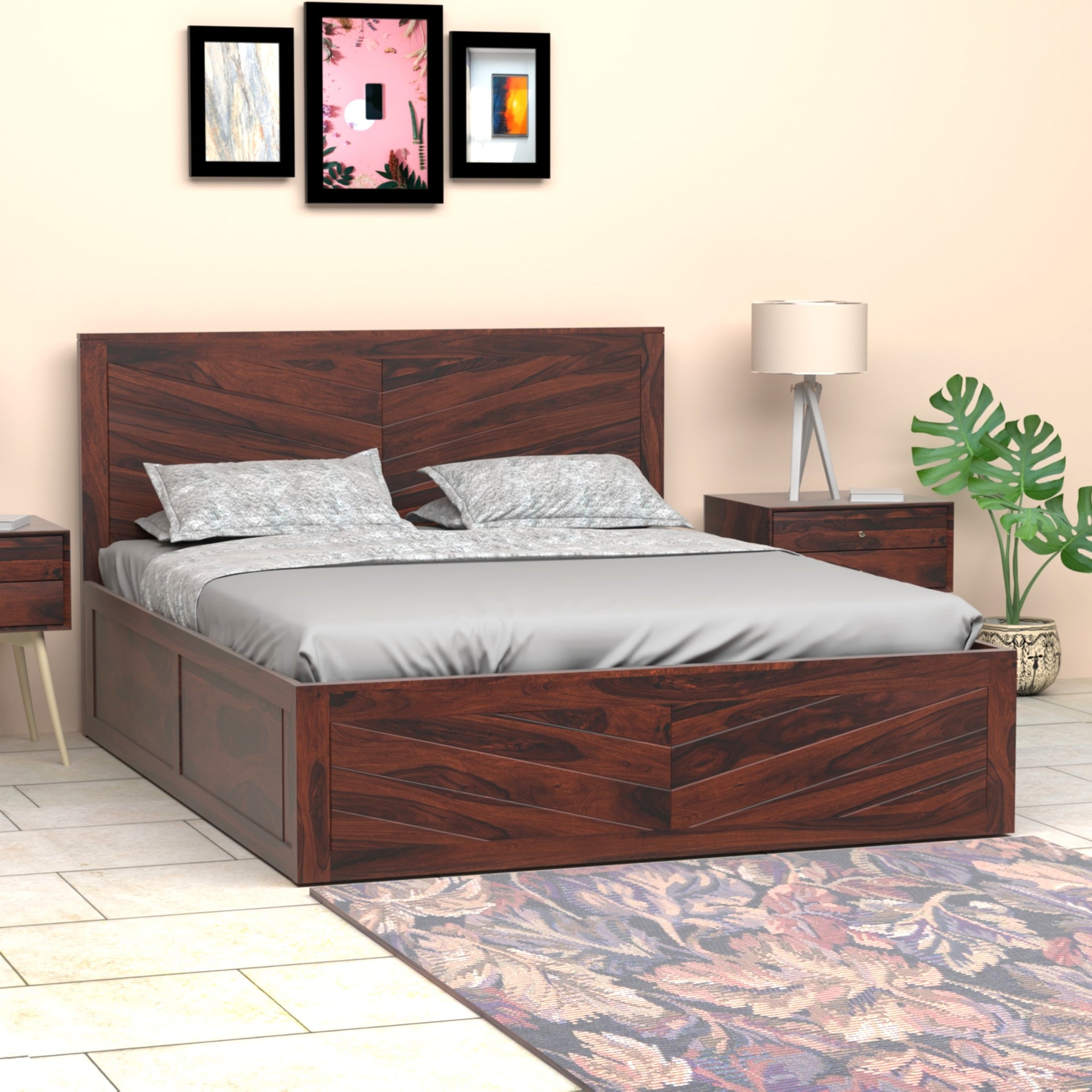 Maximize both style and functionality with the Chevron Sheesham Wood Queen Size Bed with Box Storage. Crafted from kiln-dried and chemically treated solid sheesham wood, this bed guarantees exceptional durability and a timeless aesthetic. The stylish design seamlessly integrates into any bedroom, while the queen-size dimensions, accommodating a 60x78 inch mattress, provide luxurious comfort. What sets this bed apart is its ample box storage, offering a convenient solution for keeping your bedroom organized and clutter-free. Easily store bedding, pillows, or other essentials within the spacious compartments beneath the mattress. Enjoy the perfect blend of beauty, strength, and practicality with the Diamond Sheesham Wood Queen Size Bed with Box Storage.