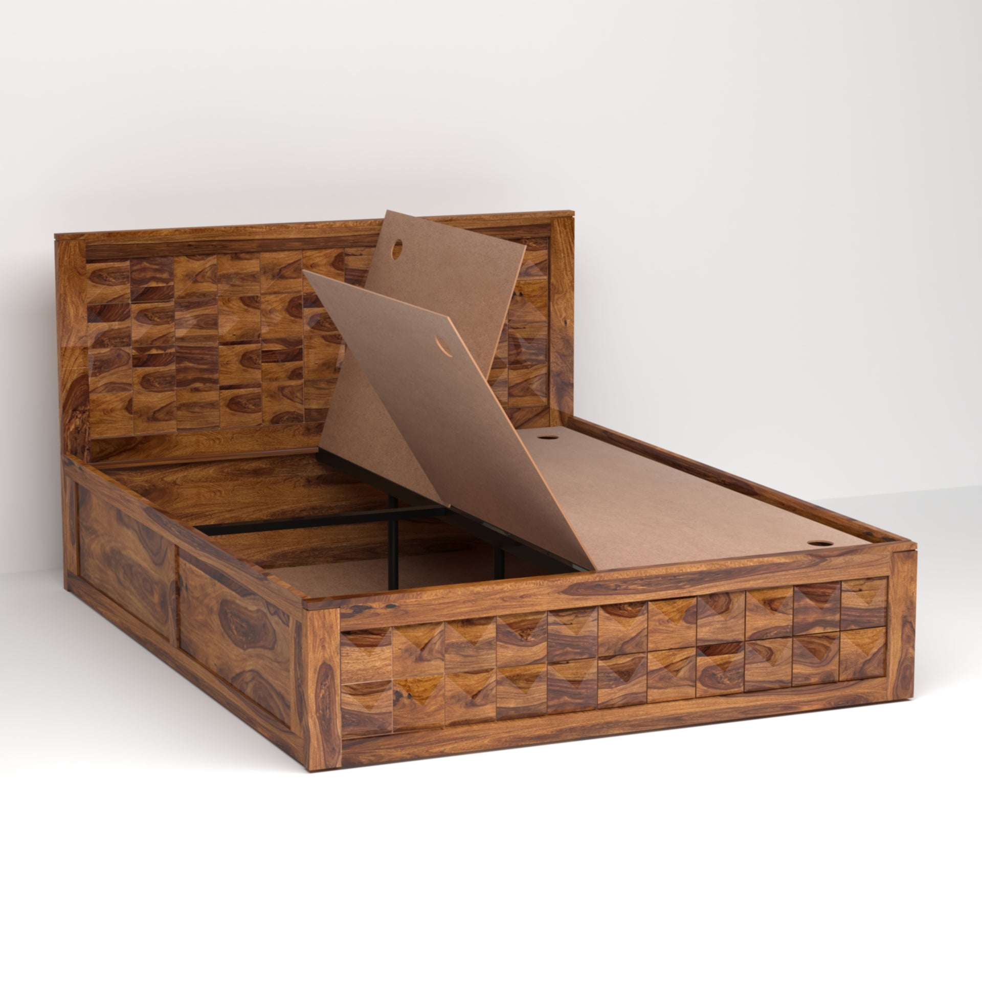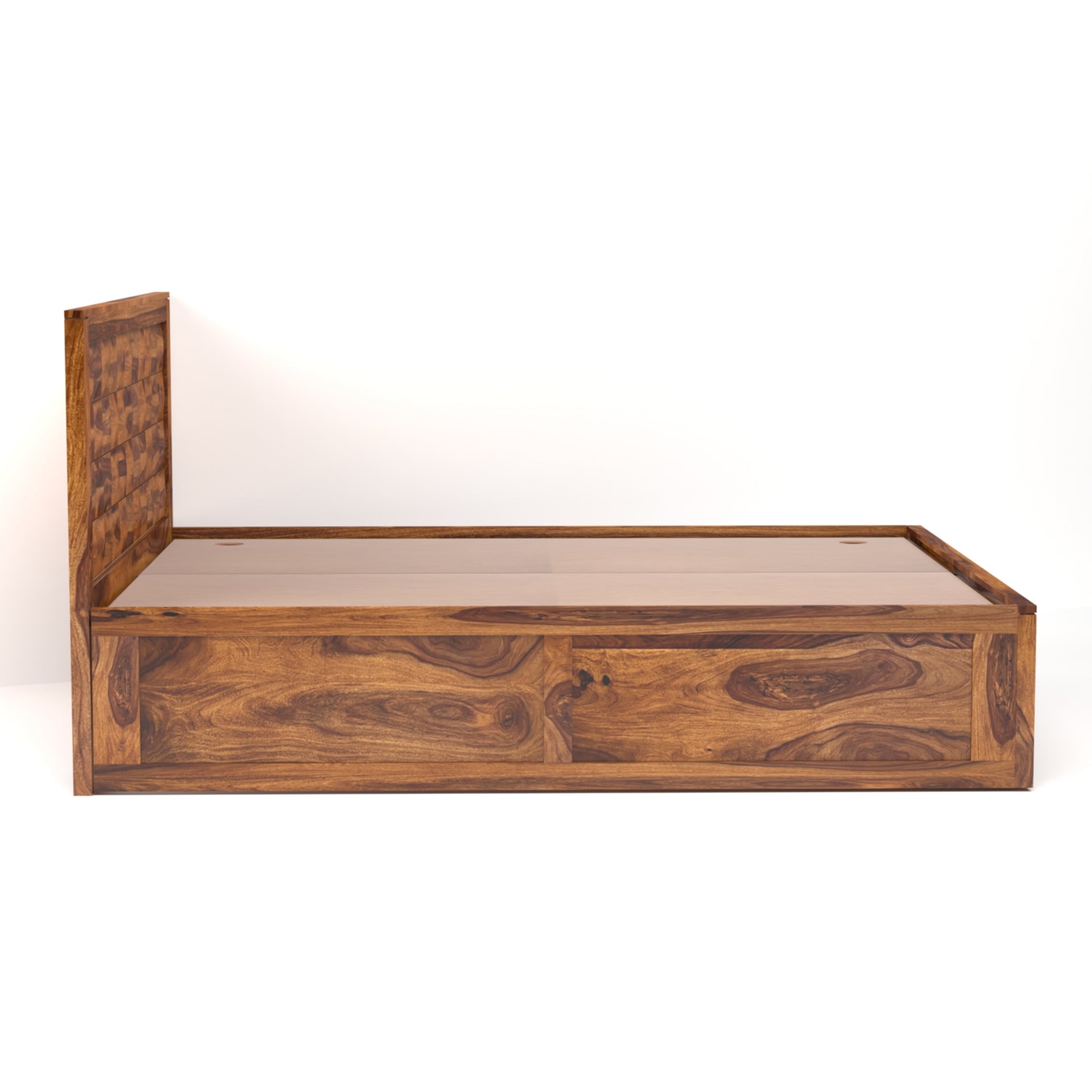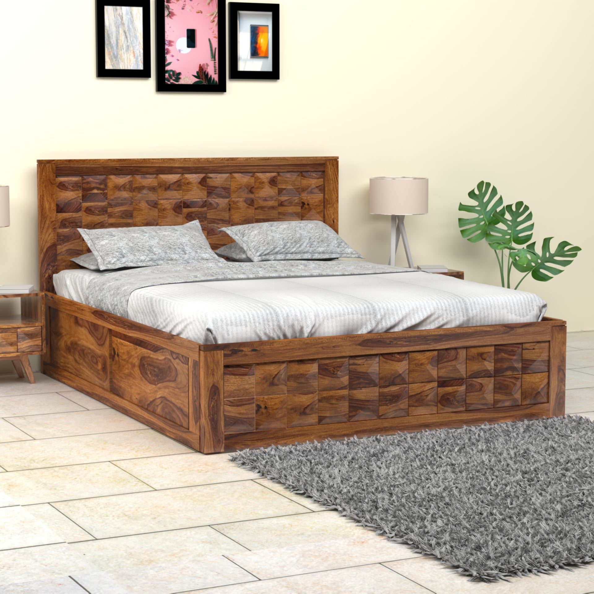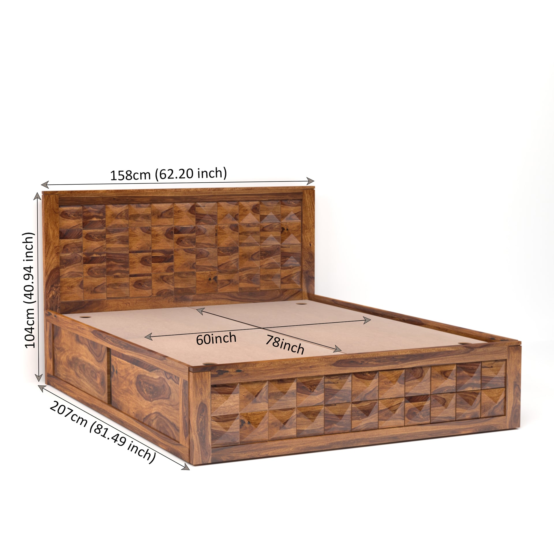 Maximize both style and functionality with the Diamond Sheesham Wood Queen Size Bed with Box Storage. Crafted from kiln-dried and chemically treated solid sheesham wood, this bed guarantees exceptional durability and a timeless aesthetic. The stylish design seamlessly integrates into any bedroom, while the queen-size dimensions, accommodating a 60x78 inch mattress, provide luxurious comfort. What sets this bed apart is its ample box storage, offering a convenient solution for keeping your bedroom organized and clutter-free. Easily store bedding, pillows, or other essentials within the spacious compartments beneath the mattress. Enjoy the perfect blend of beauty, strength, and practicality with the Diamond Sheesham Wood Queen Size Bed with Box Storage.