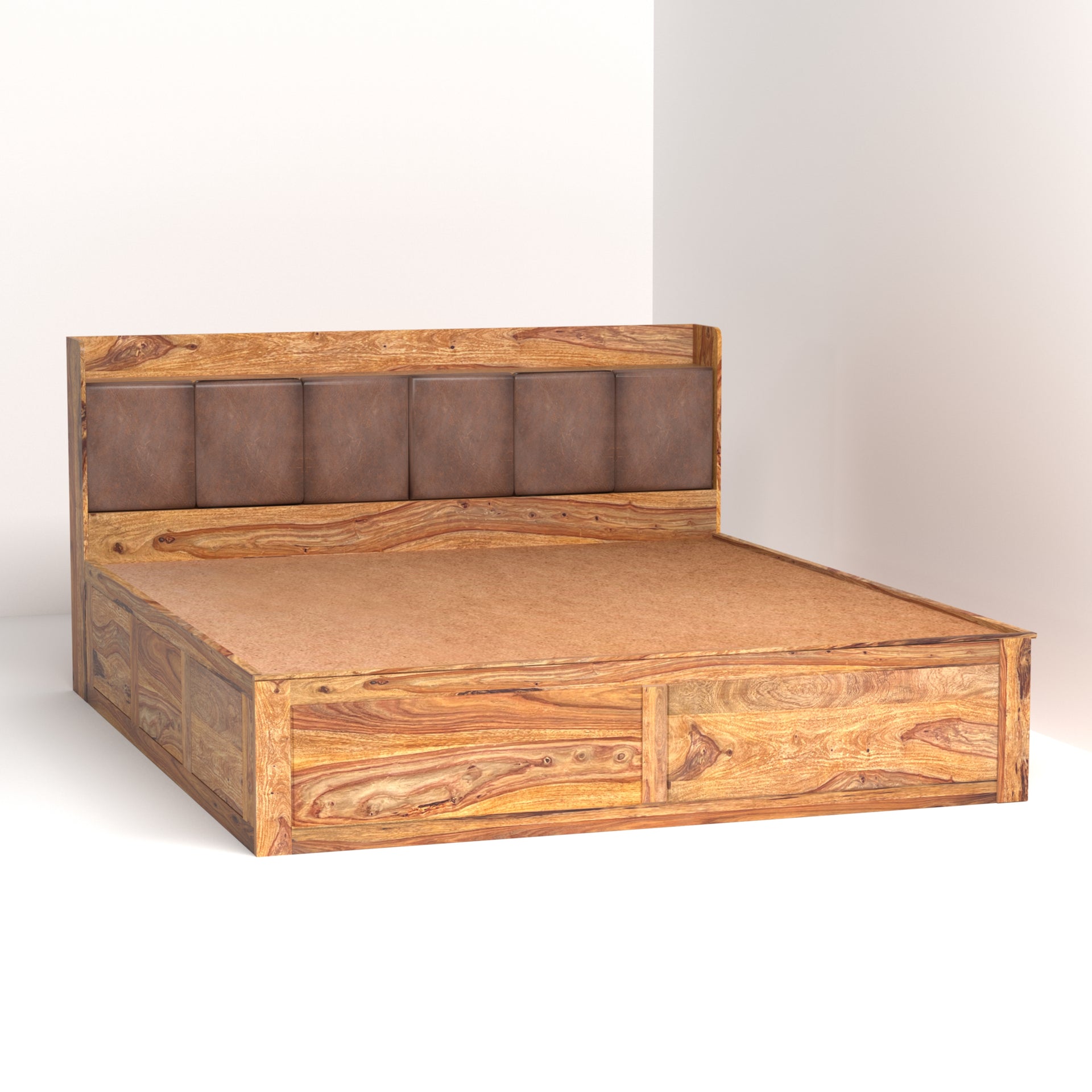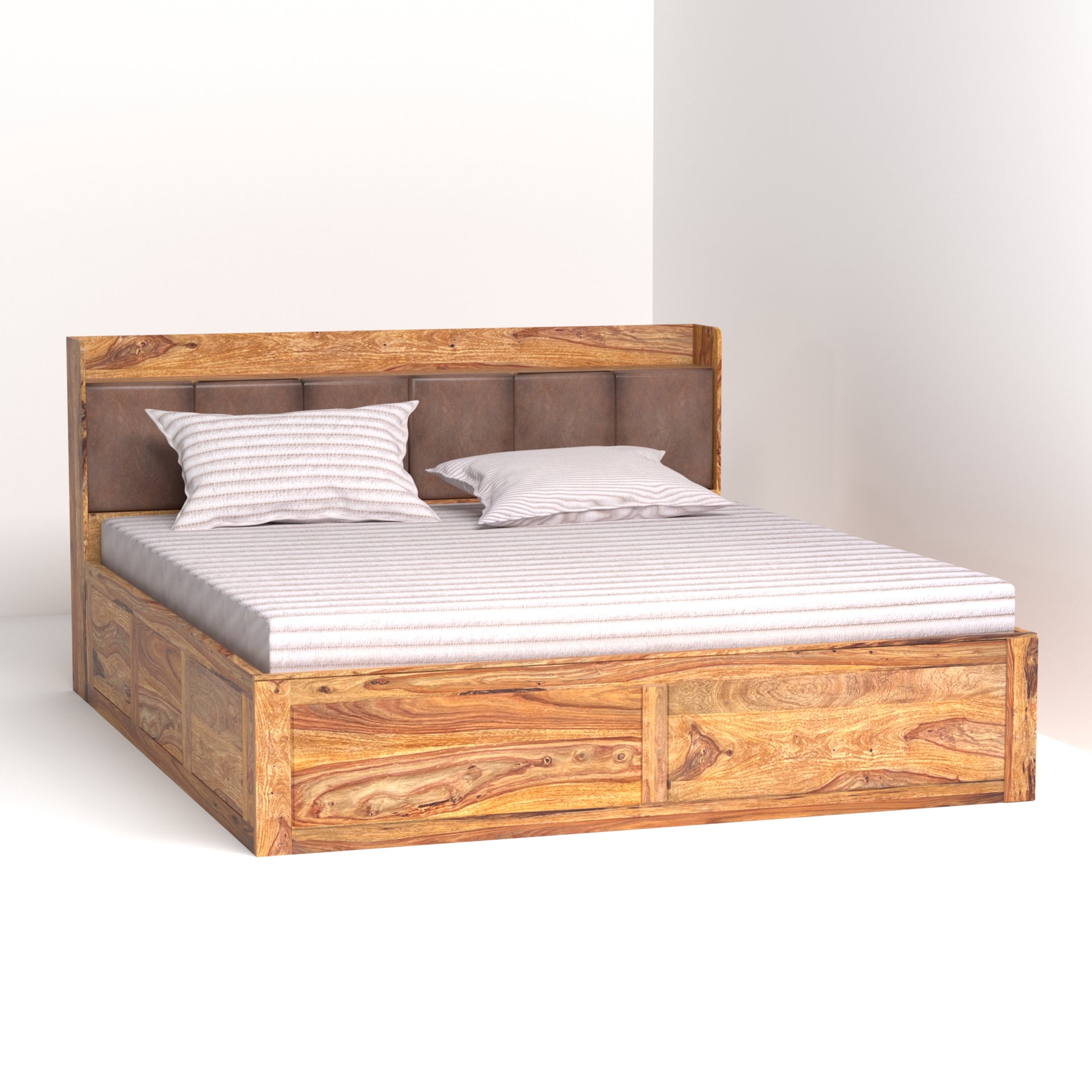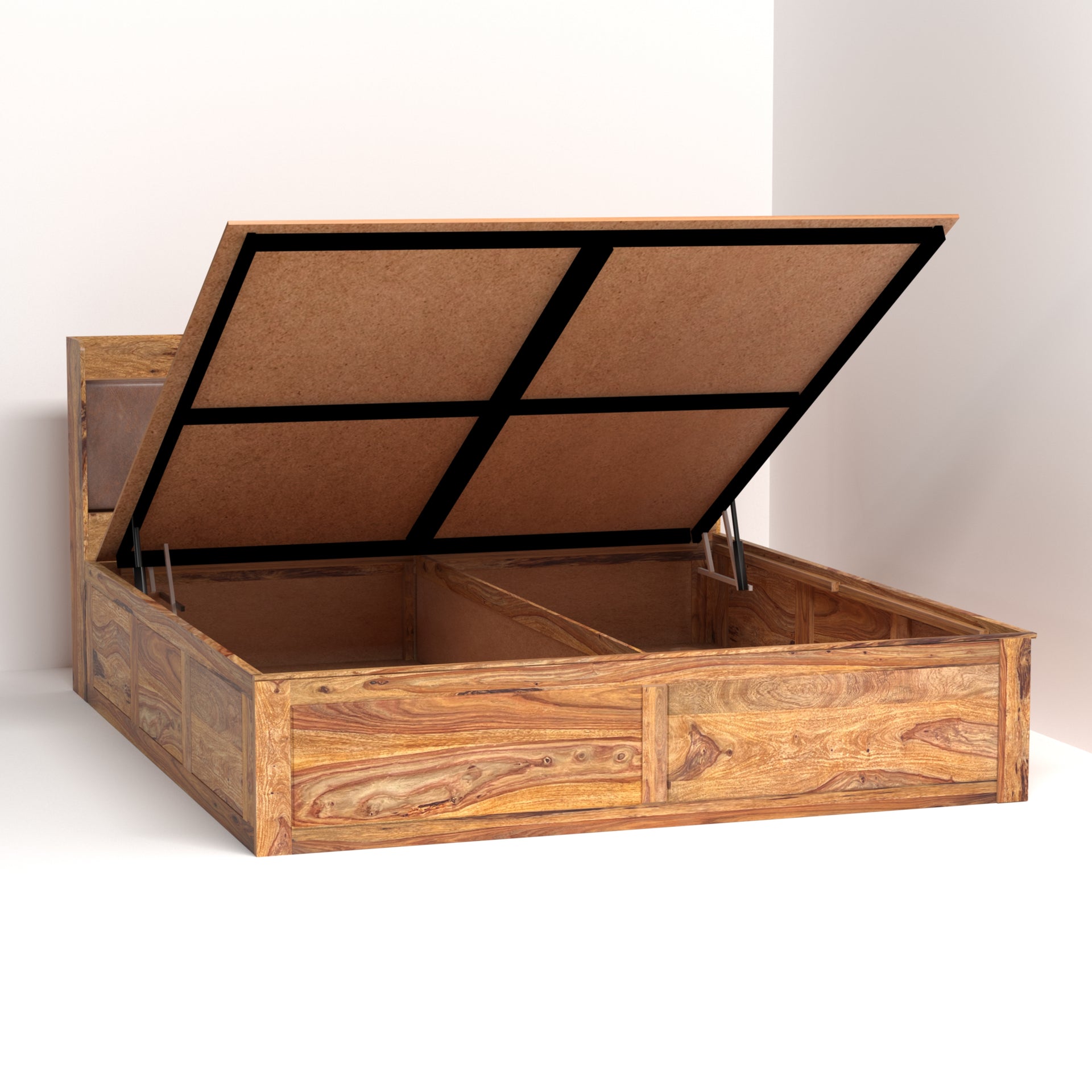 This king-size bed (72x78 inch mattress compatible) is designed for ultimate convenience. The headboard features unique cushion-door storage, providing a soft, luxurious touch while offering discreet space for your essentials. Additionally, the bed includes spacious hydraulic storage beneath the mattress, allowing you to effortlessly lift the sleeping platform and access ample space for linens, clothing, or other belongings. Enjoy the perfect combination of style, comfort, and maximized storage with the Zara Sheesham Wood King Size Bed.