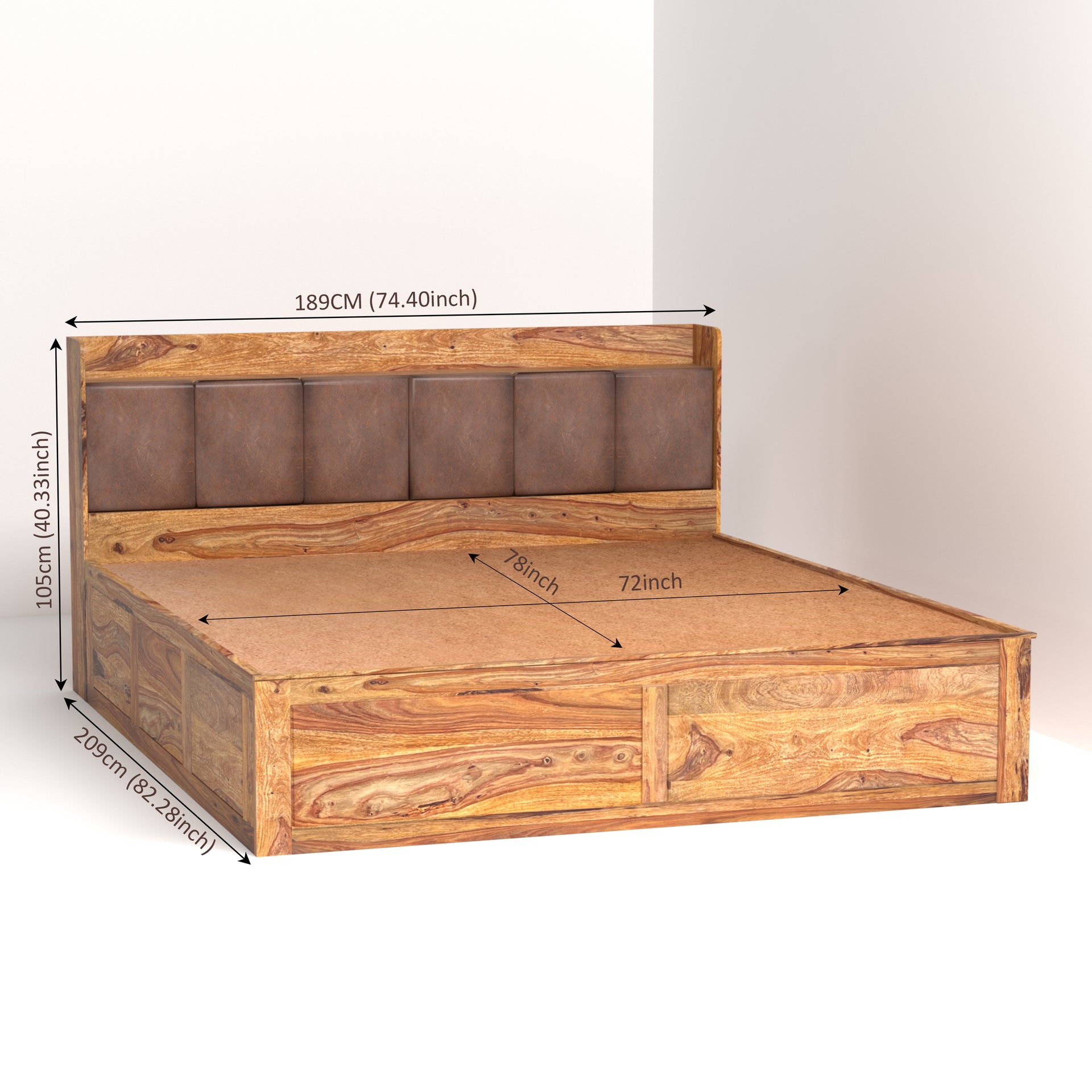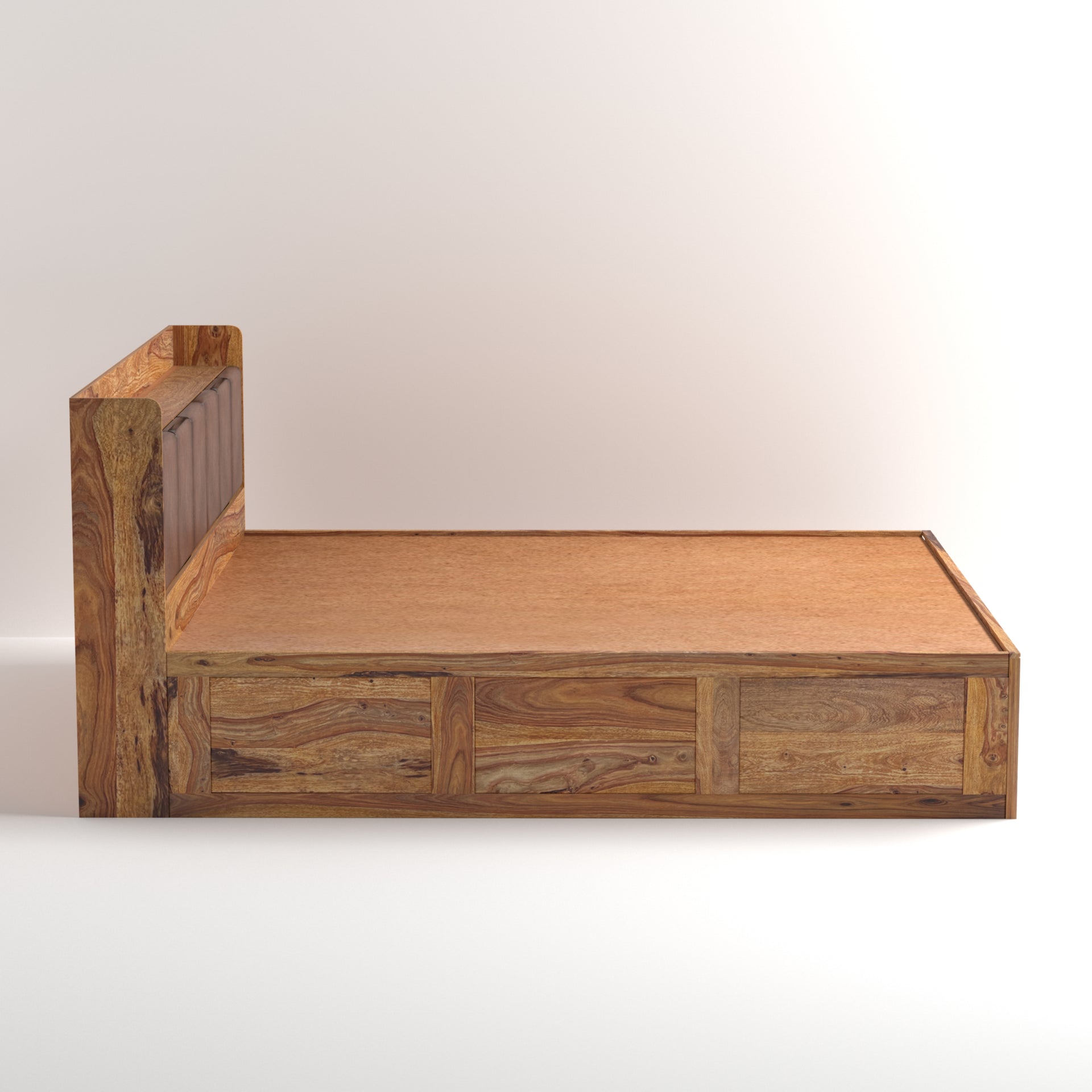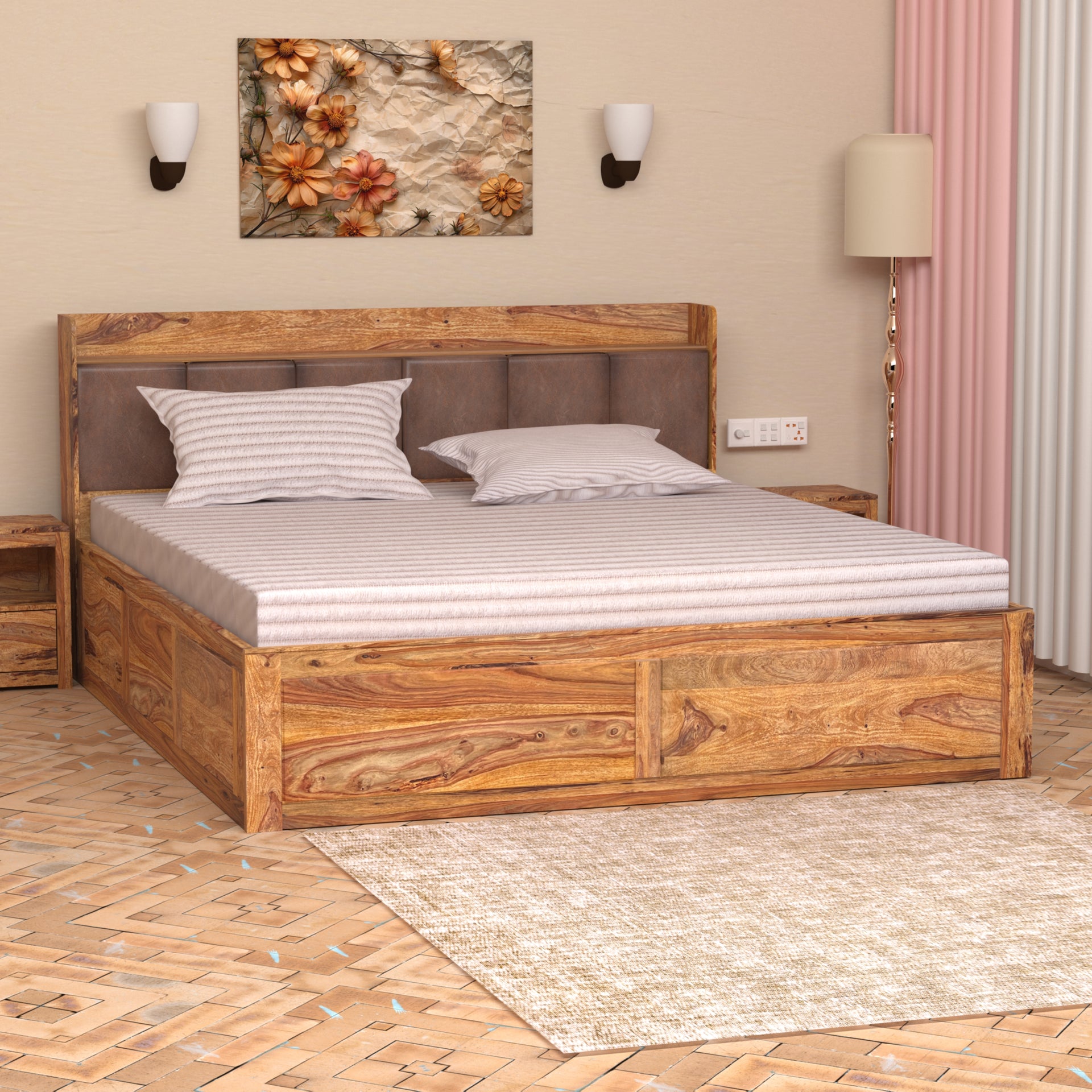 This king-size bed (72x78 inch mattress compatible) is designed for ultimate convenience. The headboard features unique cushion-door storage, providing a soft, luxurious touch while offering discreet space for your essentials. Additionally, the bed includes spacious hydraulic storage beneath the mattress, allowing you to effortlessly lift the sleeping platform and access ample space for linens, clothing, or other belongings. Enjoy the perfect combination of style, comfort, and maximized storage with the Zara Sheesham Wood King Size Bed.